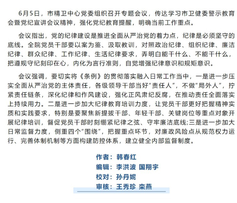 【黨建領航】學(xué)紀明紀守紀 築牢廉政防線(xiàn)——市精(jīng)衛中(zhōng)心傳達貫徹市衛健委警示教育會暨黨紀宣講會議精(jīng)神